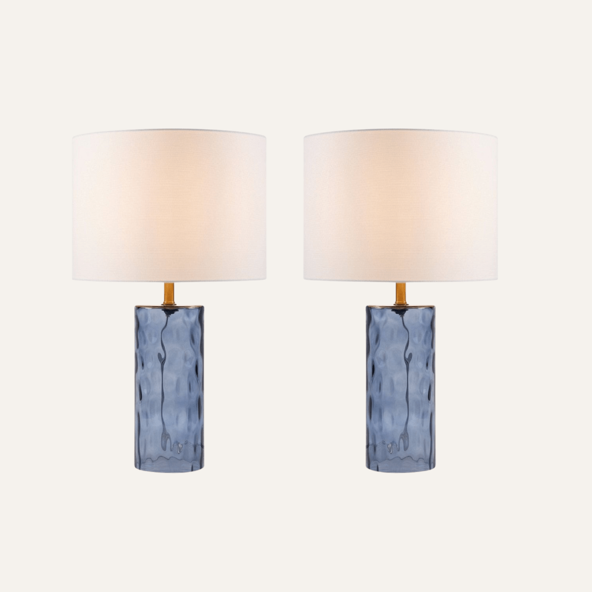 The lamp is crafted from durable water ripple blue glass and a metal neck with a brass plating finish. The shade is classic white fabric.