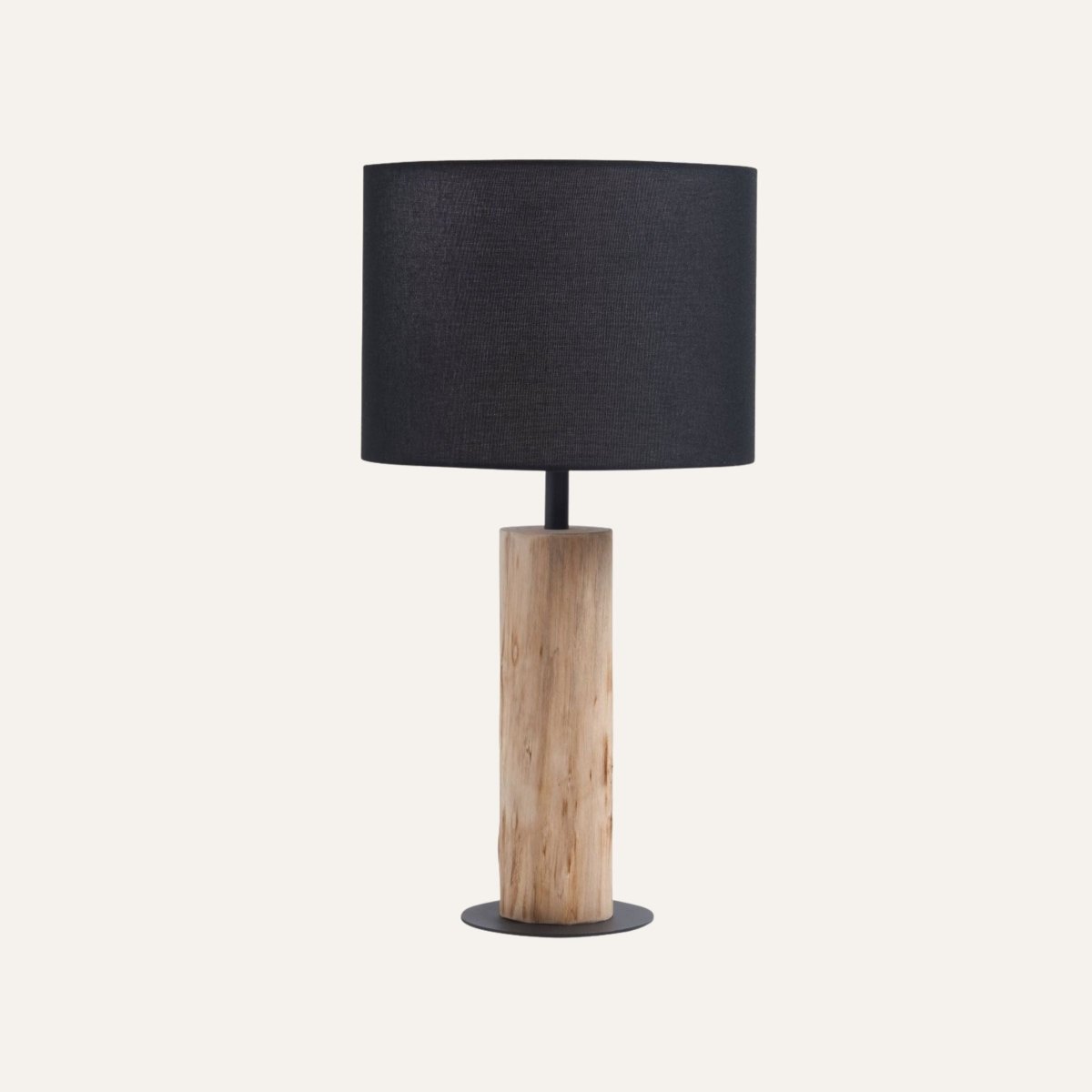 The Lignis Table Lamp blends rustic modern style with a solid wood base featuring natural textures. Available with a black shade and black metal for a bold look or a white shade with gold metal for elegance, its unique wood grain enhances any decor.