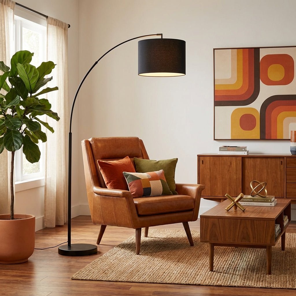 Dark, warm, modern. This elegantly arched lamp brings a bold black touch to any corner. It’s complete with a marble base, steel pole, and round fabric shade. The dark shade diffuses the light within to create a cozy, ambient glow — softly illuminating your bedroom or favorite living room reading nook.