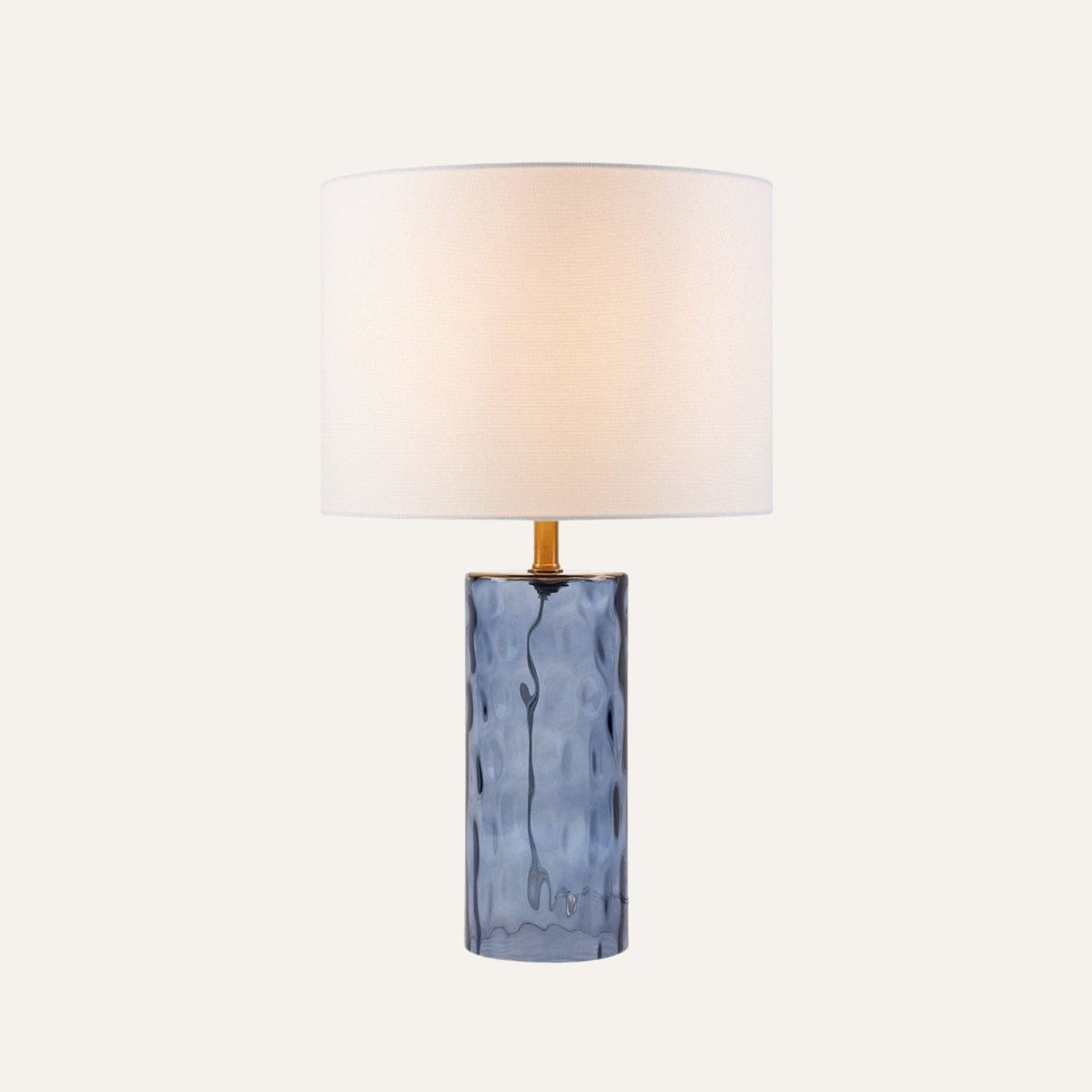 The lamp is crafted from durable water ripple blue glass and a metal neck with a brass plating finish. The shade is classic white fabric.