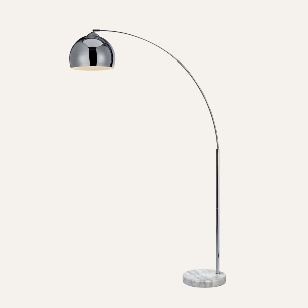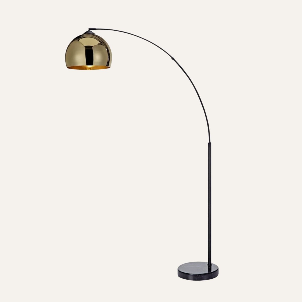 The Hana offers a modern arc floor lamp aesthetic with a subtle industrial edge. It features a sleek arc and a dome-shaped shade available in a brass arc floor lamp finish (or chrome/painted), paired with a sturdy marble base.